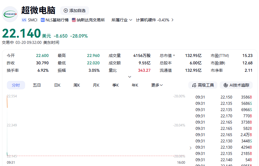 受此消息影响,当地时间3月20日,超微电脑股价开盘暴跌,截至发稿,该股跌超28%。