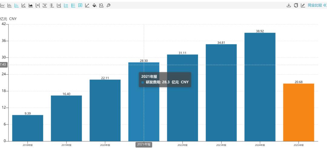 再来看看“研发费用”。Wind数据显示,自2018年以来科大讯飞研发费用屡屡突破新高。2018年,公司研发费用还只有9.39亿元,到2024年,这一数字已经攀升到了38.92亿元。