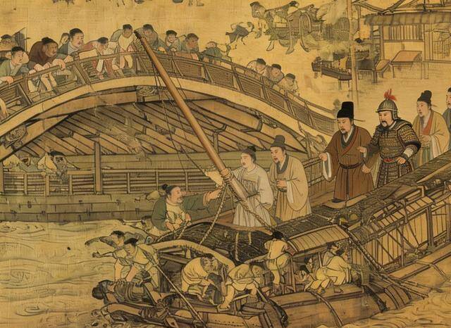 一艘大船即将撞向拱桥,船工手忙脚乱放倒桅杆,桥上百姓惊呼指点,整幅画面张力拉满。