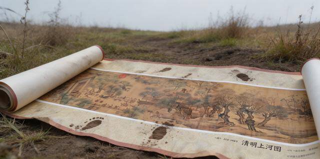 画中藏着更残酷的细节:有人把写满文字的屏风、书卷,当作包裹货物的苫布,随意践踏、丢弃郊外。