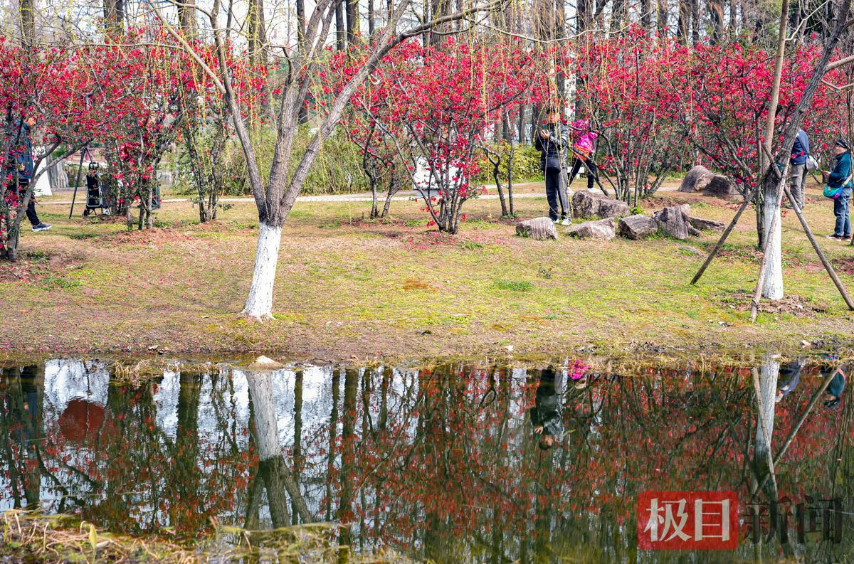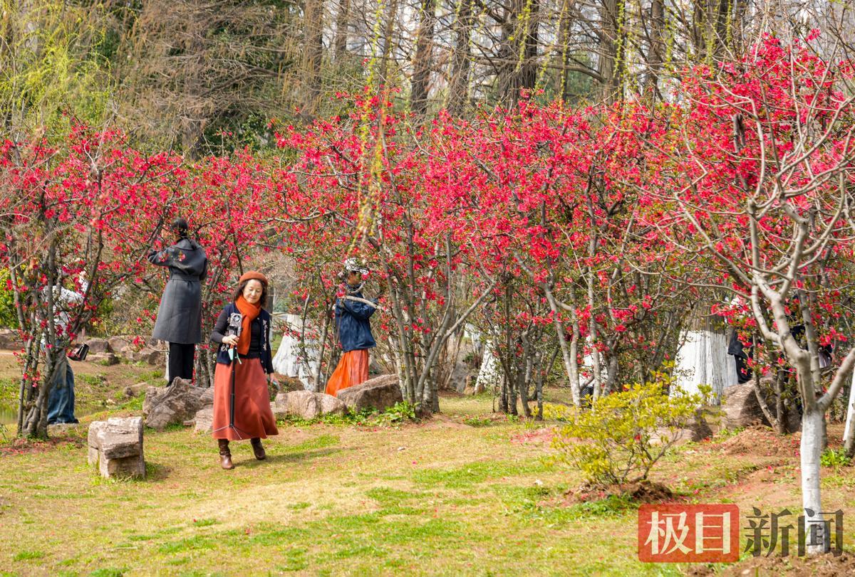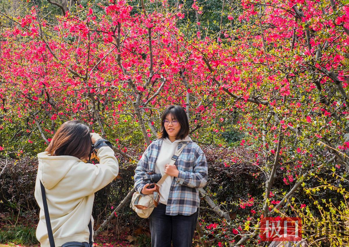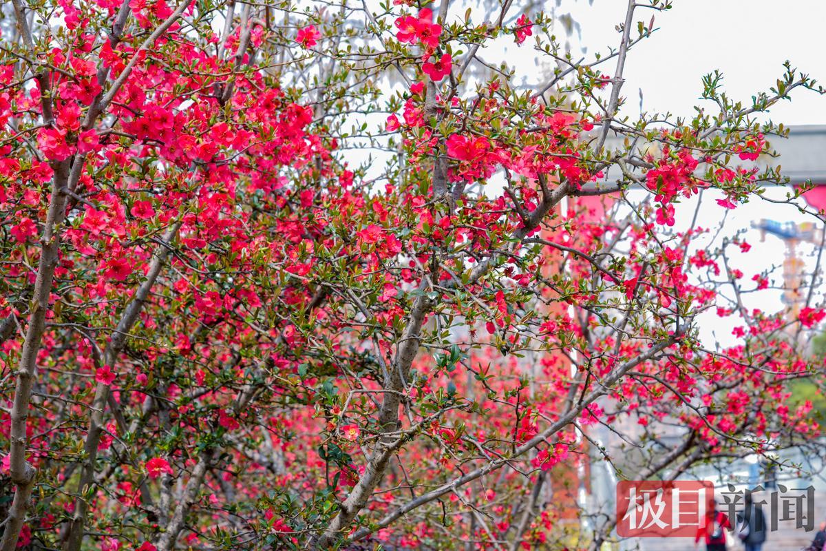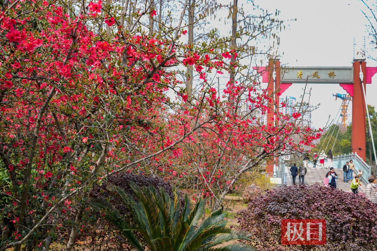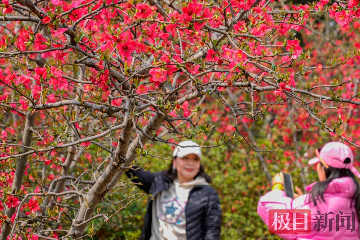 3月12日,武汉青山公园38丛贴梗海棠成片盛开,海棠花花红蕊黄,色彩艳丽,美成一道道火红的屏风,吸引了众多市民前往观赏、打卡。据悉,贴梗海棠是海棠家族中开花最早的品种,花期过后,武汉各公园的垂丝海棠、湖北海棠、西府海棠、绚丽海棠等会接力绽放。